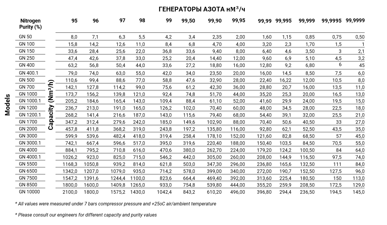 Используя технологию PSA, AIRSYST производит генераторы азота с чистотой до 95% — 99,9999% (1 ppm) в диапазоне 0,5–5000 Нм3/ч с 30 моделями.