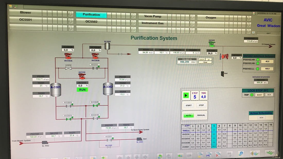 Система управления построена на контроллерах и программном обеспечении Siemens. Позволяет контролировать основные параметры установки по разделению воздуха, такие как: