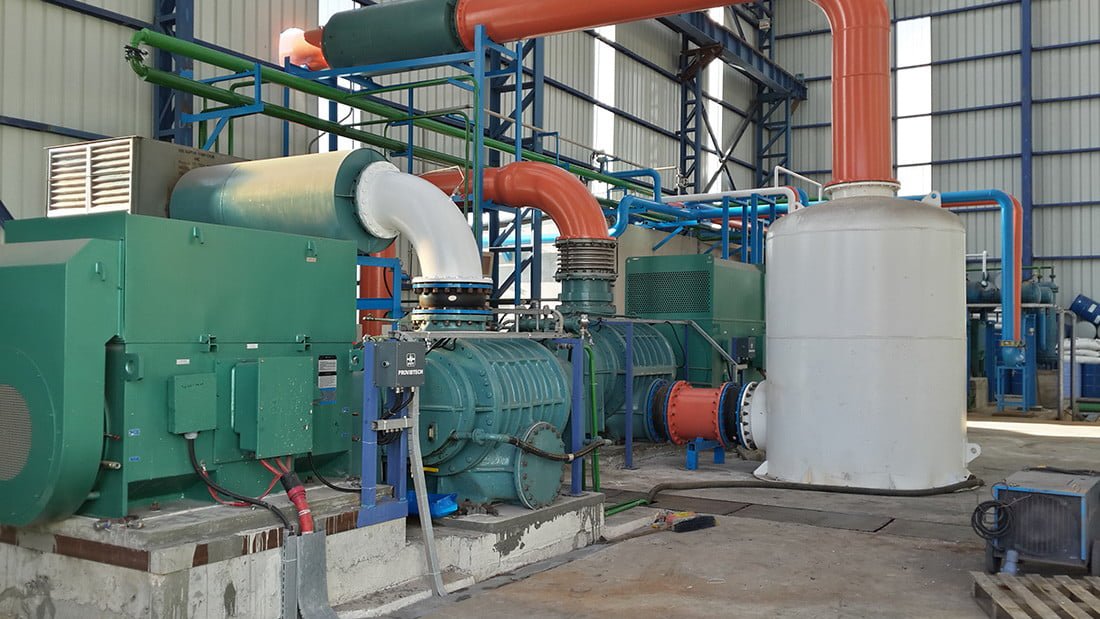 Корневая воздуходувка и вакуумный насос создают среду с низким давлением 0,49 кПа. В отличие от систем с компрессорами, самым большим преимуществом работы при низком давлении является низкое потребление энергии. Таким образом, оборудование системы не попадает в класс сосудов высокого давления и легко устанавливается на заводе.
